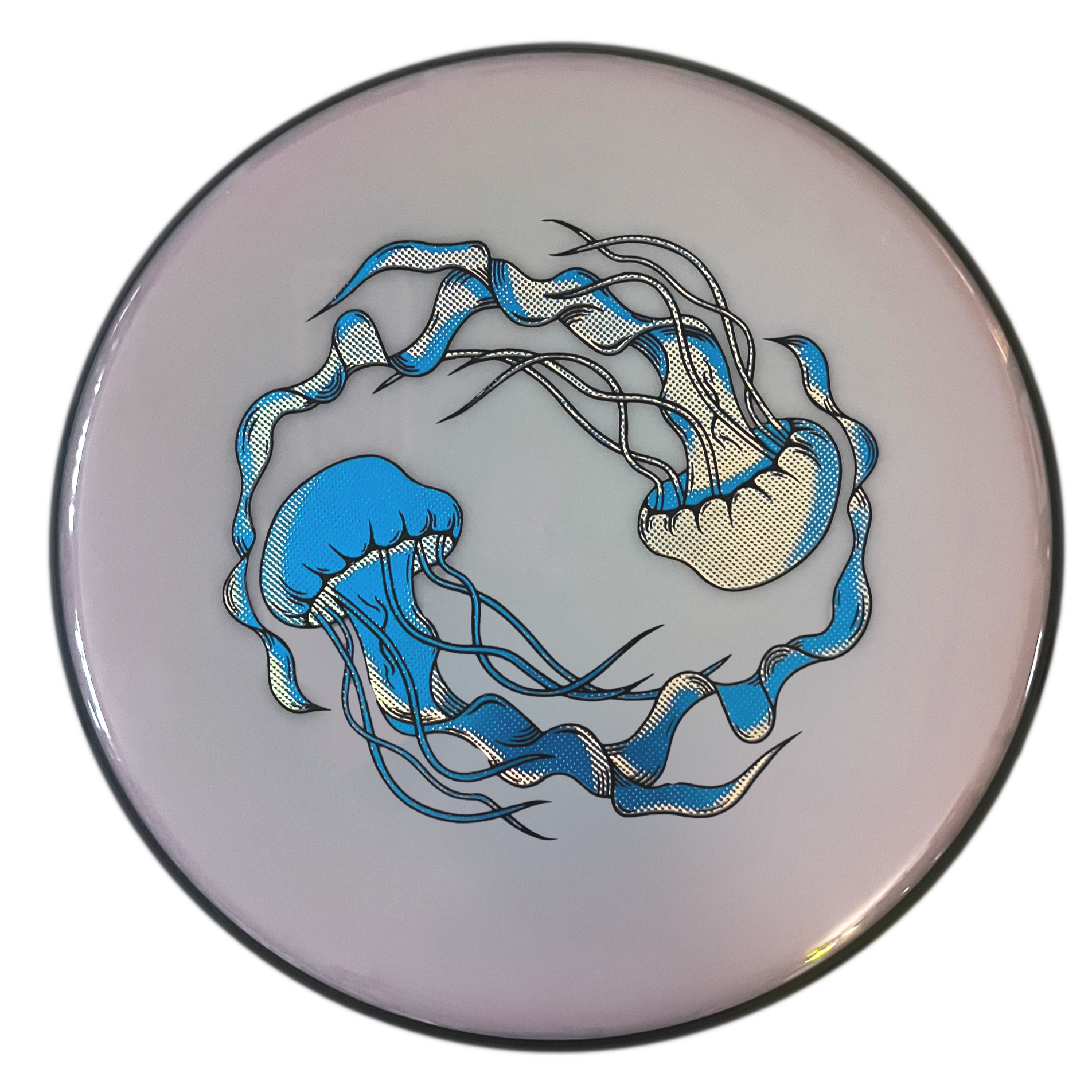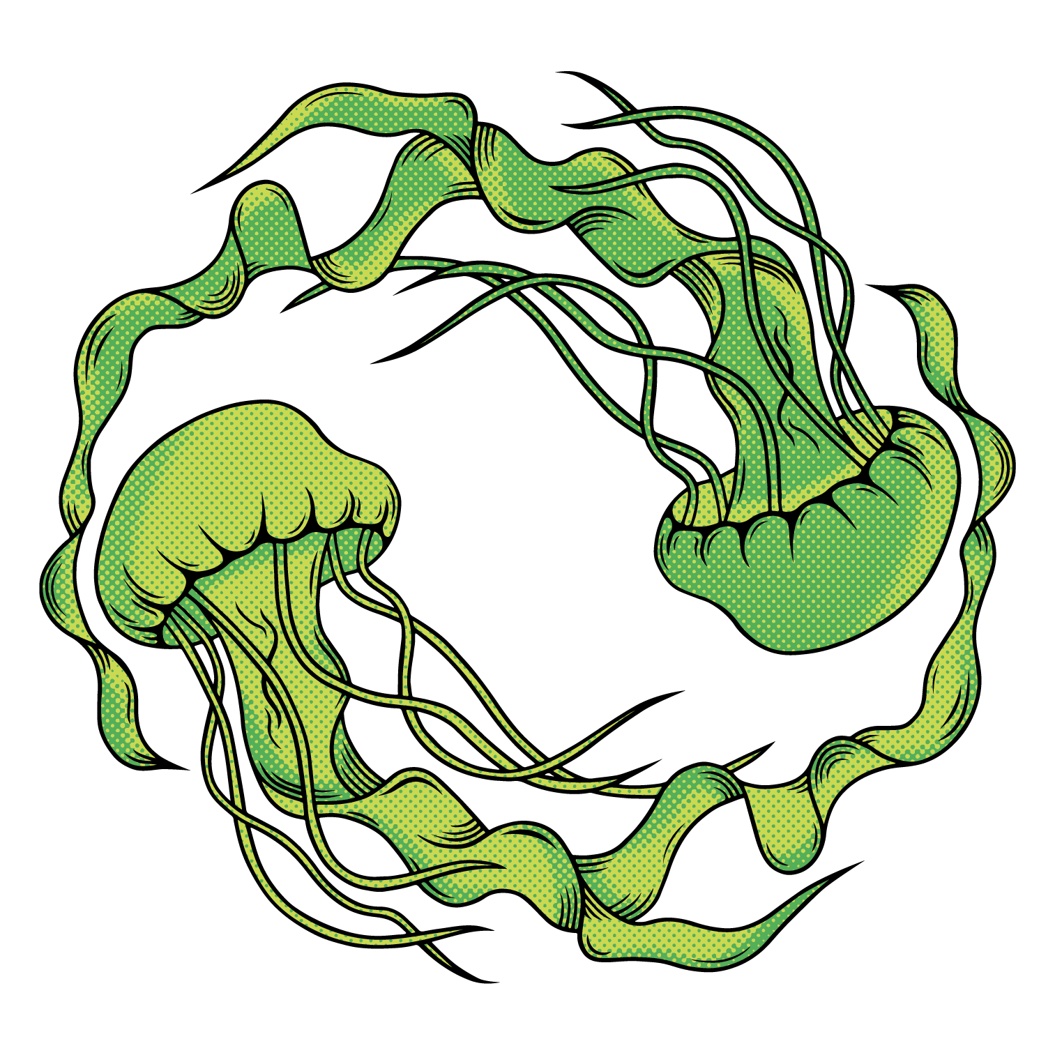Illustration created for professional frisbee golfer, James Conrad. I was approached by James Conrad in 2023 to create an illustration of a yin-yang jellyfish for his new disc. Featured is the illustration process, from sketch, to halftone vector, to final production disc.